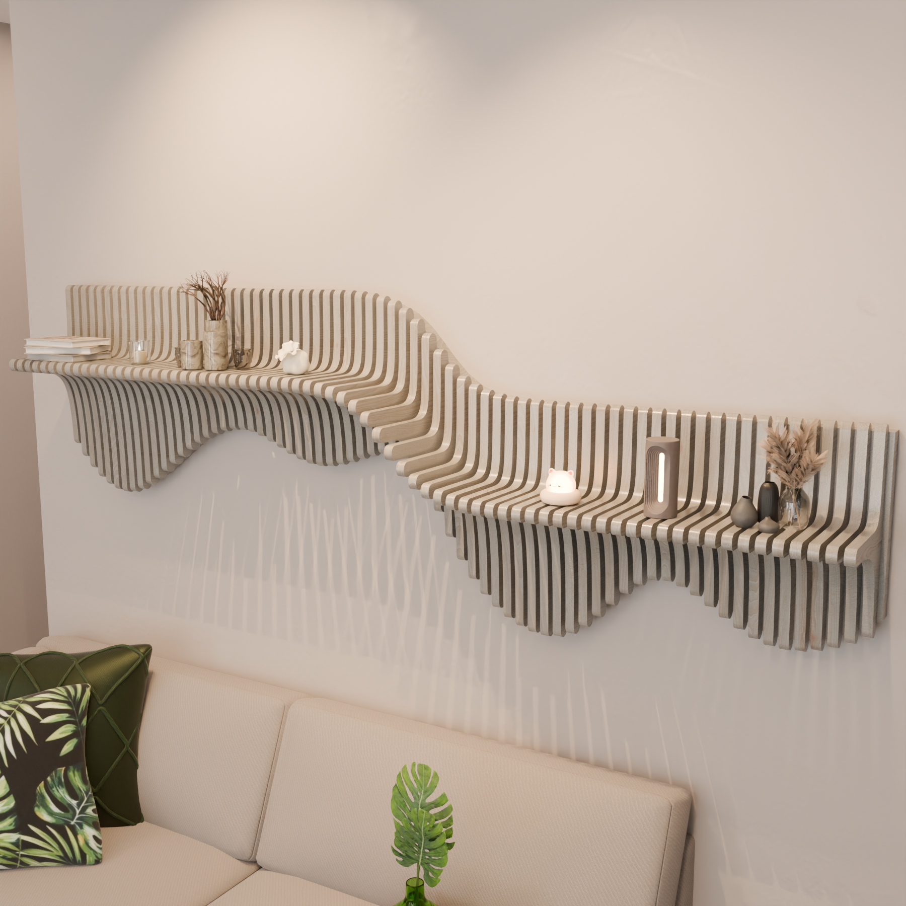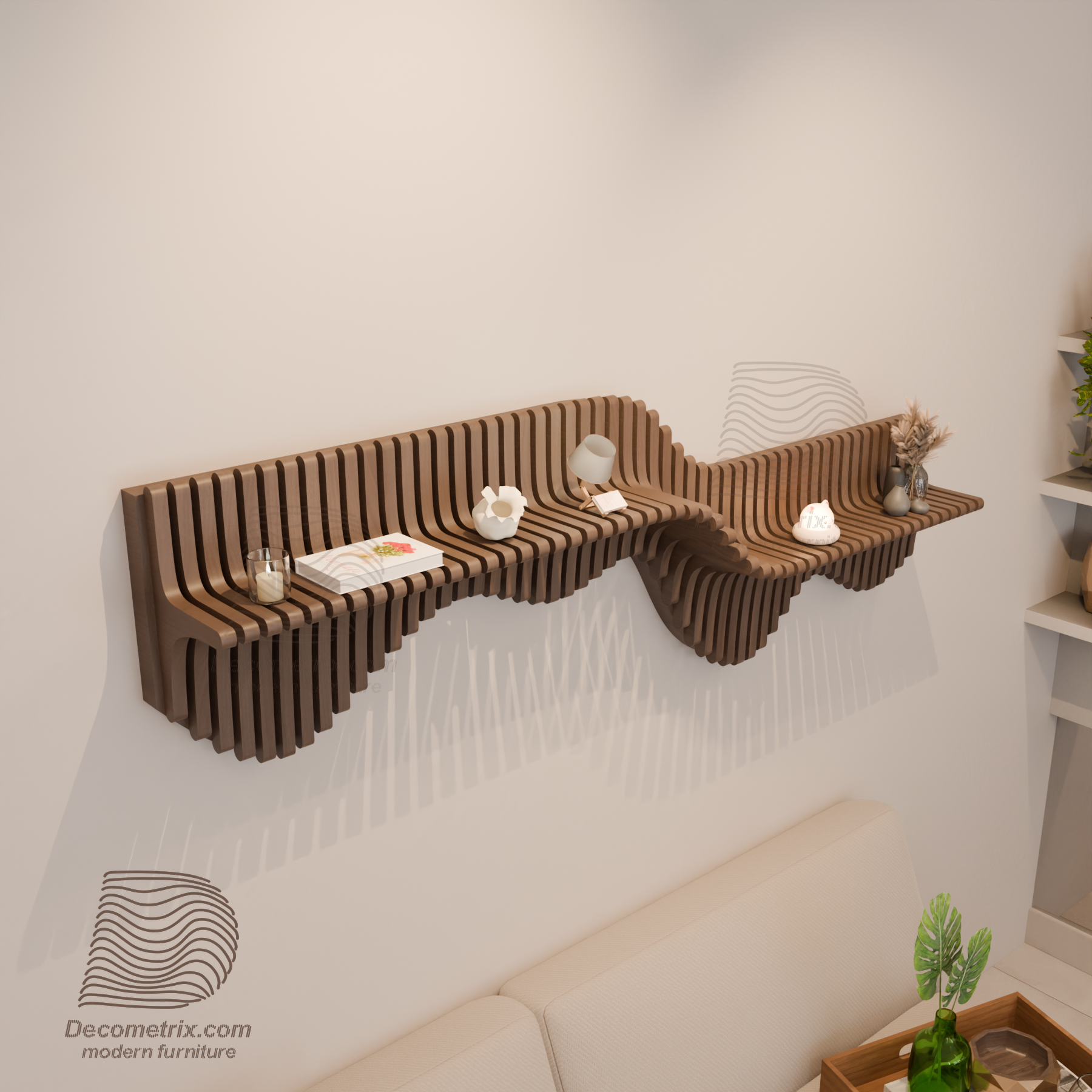 يُعد رف موديل M6 أحد أكثر التصاميم البراميترية جاذبية، بموجات انسيابية تمنح الحائط عمقاً وأناقة مع لمسة فنية معاصرة.