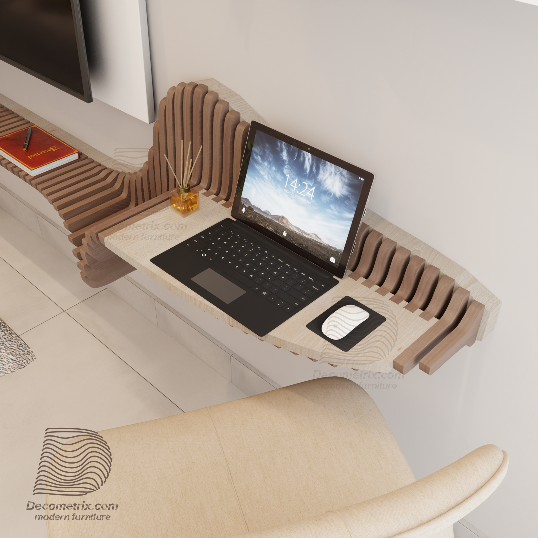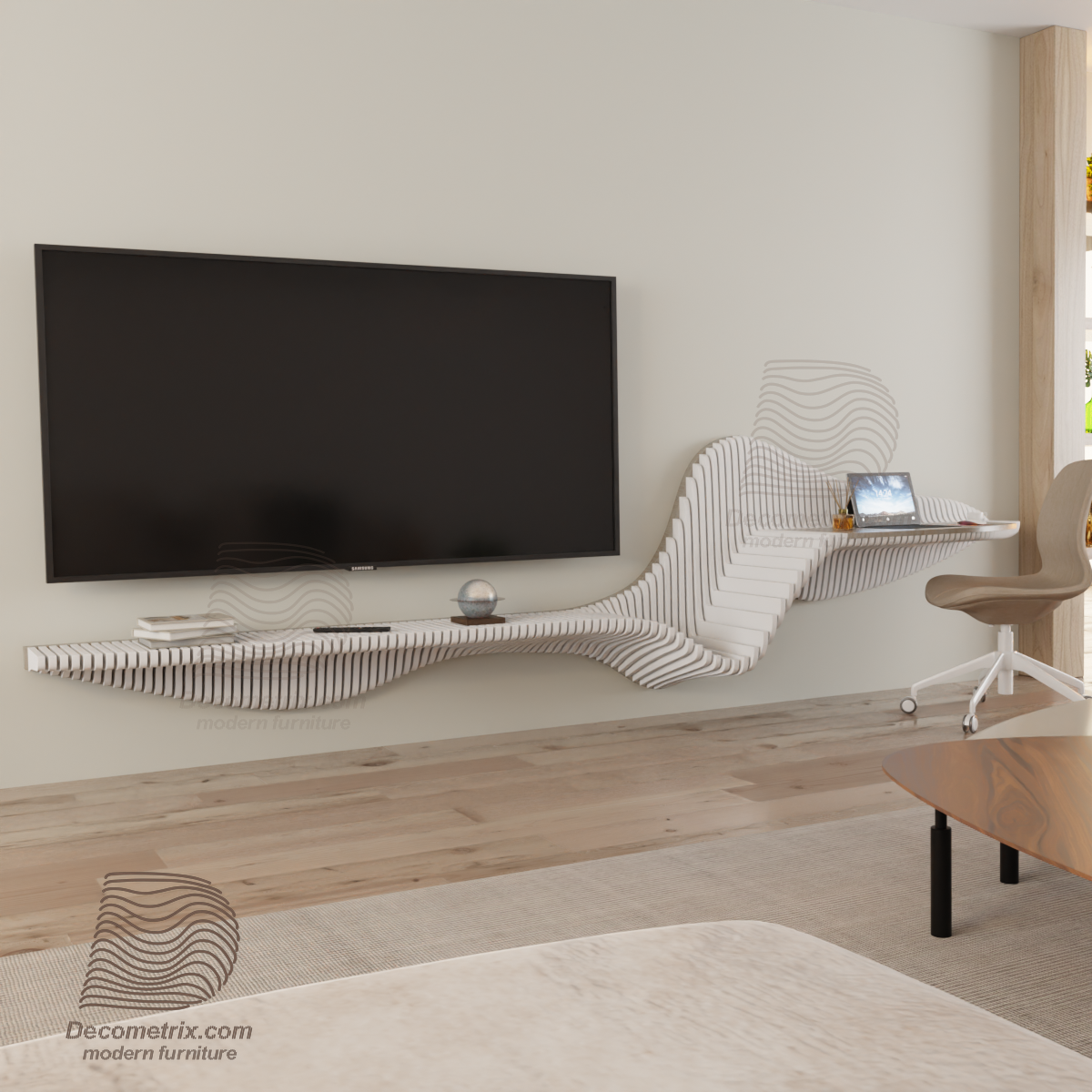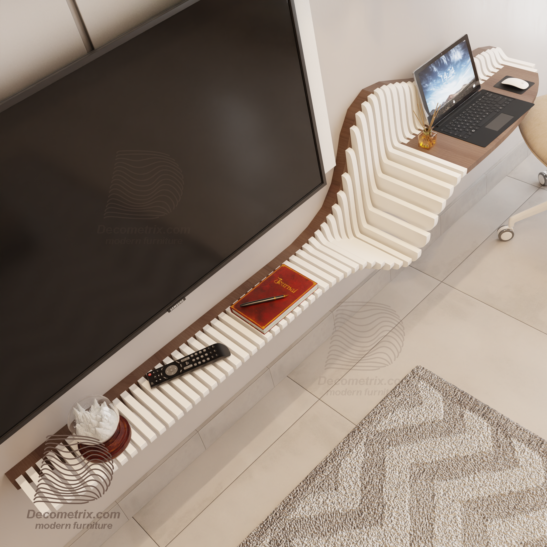 An innovative design that combines a TV unit and a functional desk in one piece, inspired by modern parametric architecture.